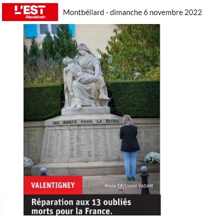 VALENTIGNEY : 13 combattants ont enfin leurs noms sur le monument aux morts (11/11/2022) Liens vers le compte-rendu et vers le journal télévisé 19-20 |