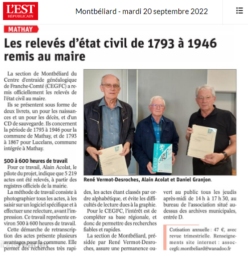 MATHAY : Remise des relevés d'état-civil 1793-1946 (20/09/2022) |