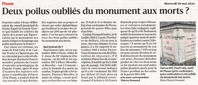 PLASNE : Deux poilus oubliés sur le monument aux morts ? (mai 2024) |