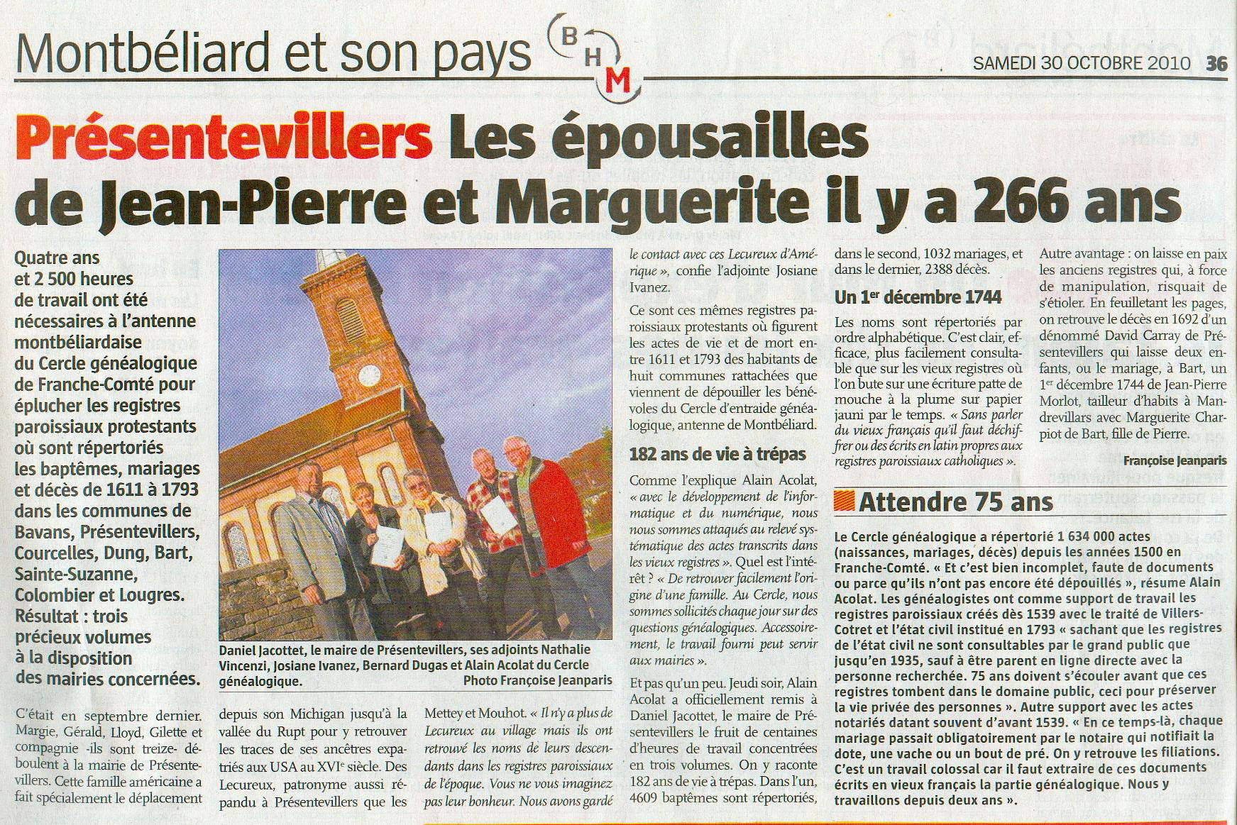PRÉSENTEVILLERS : Les épousailles de Jean-Pierre et Marguerite il y a 266 ans |
