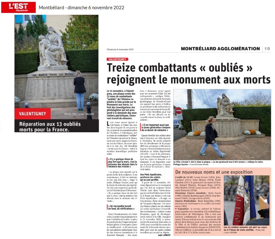 VALENTIGNEY : 13 combattants ont enfin leurs noms sur le monument aux morts (11/11/2022) Liens vers le compte-rendu et vers le journal télévisé 19-20 |