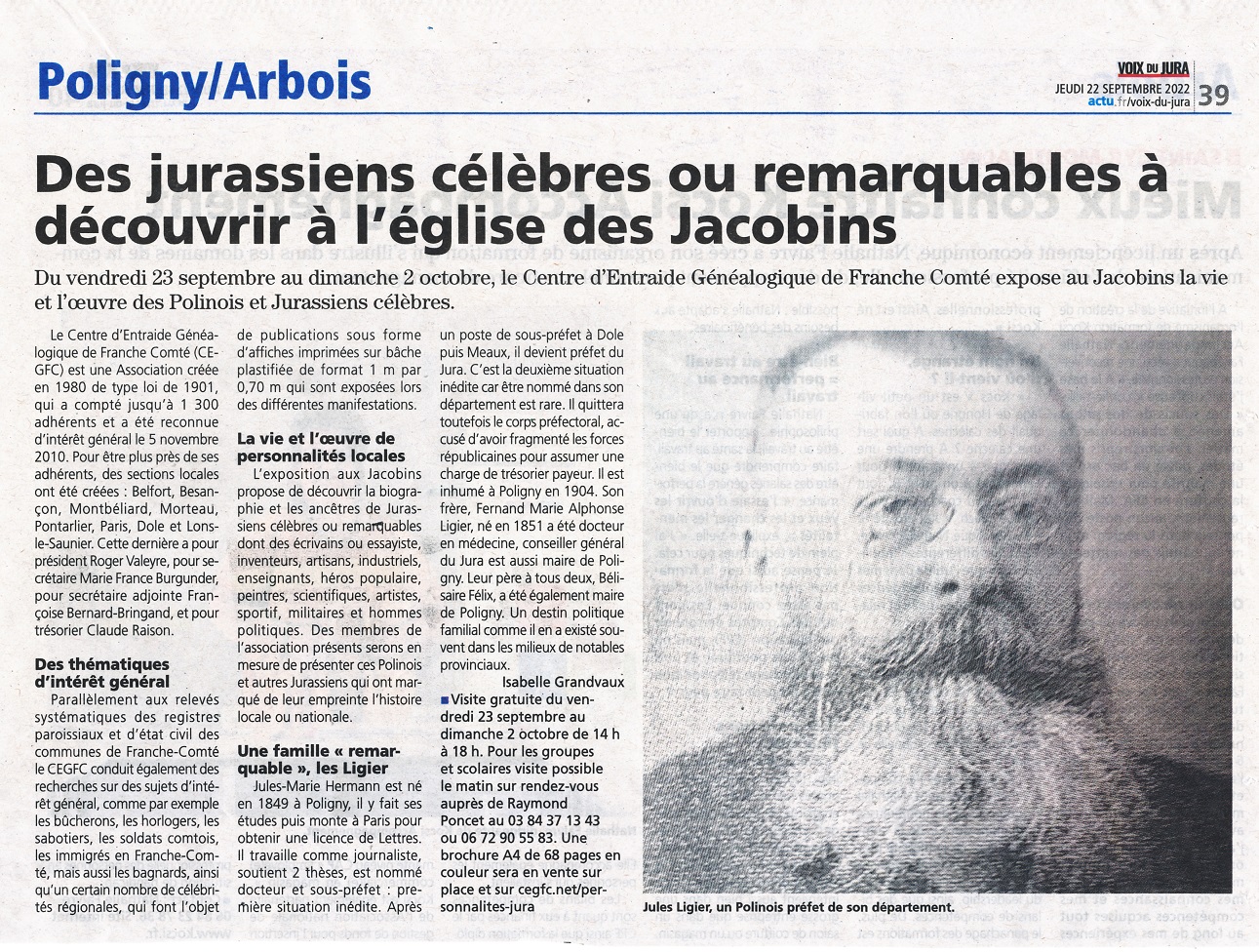 POLIGNY : Jurassiens célèbres ou remarquables aux Jacobins ; CEGFC Lons-le-Saunier (22/09/2022) |