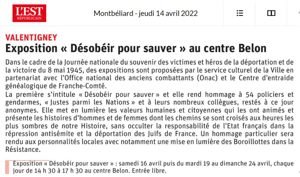 VALENTIGNEY : Exposition "Désobéir pour sauver" au centre Belon (14/4/2022) |